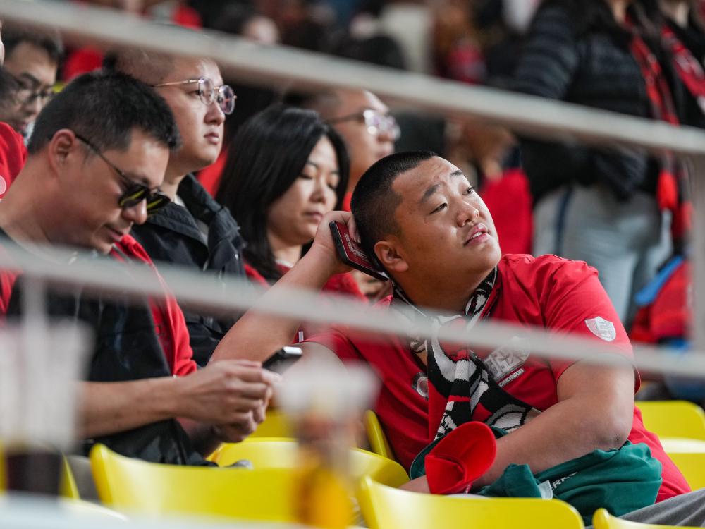 10月31日,成都蓉城隊球迷在主隊不敵河南俱樂部酒祖杜康隊后表情失落。新華社記者 王曦 攝