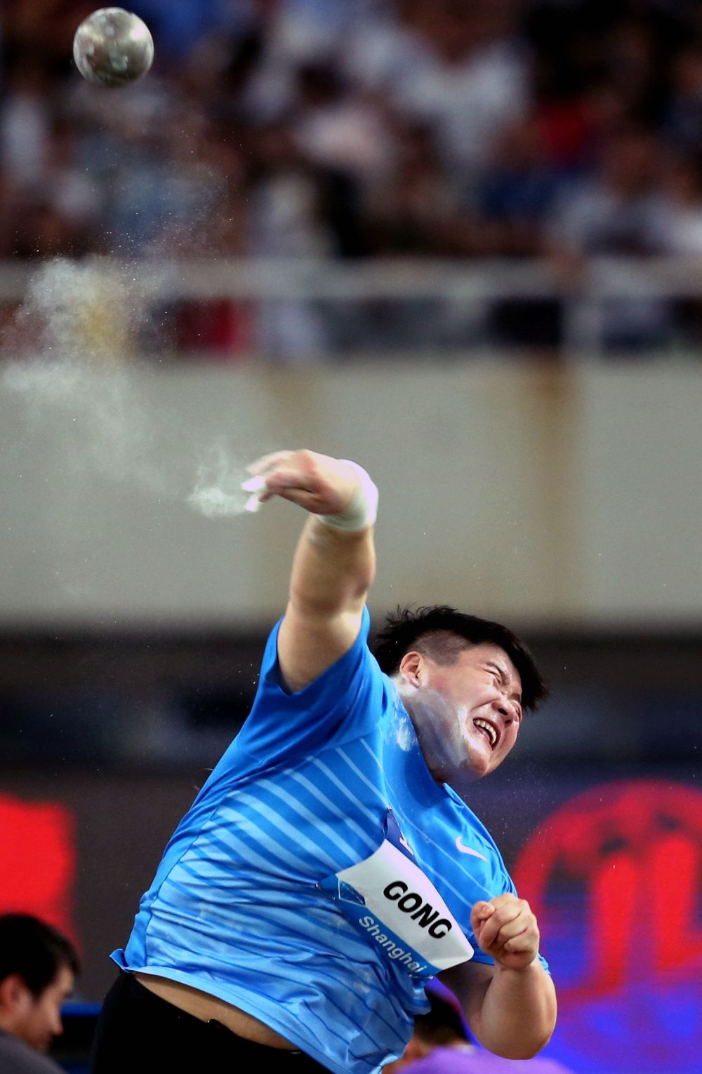 2018年5月12日,鞏立姣在鉆石聯賽上海站女子鉛球比賽中。新華社記者 凡軍 攝