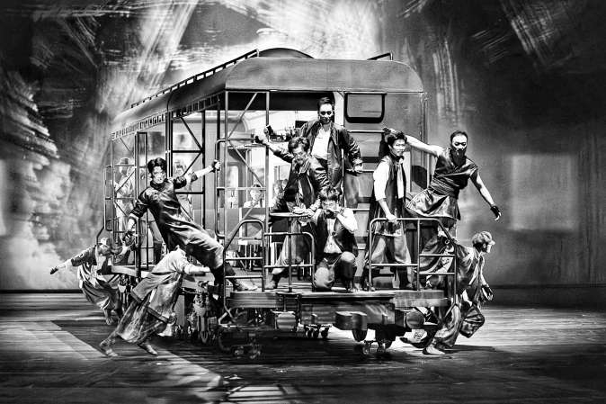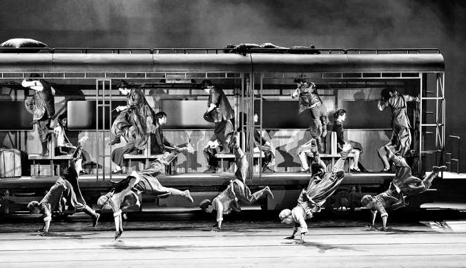 大幕拉開,極度困苦的百姓在鐵道上冒死爭搶日軍物資,槍聲響起,鮮血四濺。日寇的鐵蹄無情踐踏,鄉親們扭曲的軀體凝成無聲卻痛苦的吶喊。人群中,抗爭的身影開始屹立,李正、劉洪、王強等為首的鐵道游擊隊依靠群眾的深厚根基,以微山湖為根據地,在列車飛馳的鐵道上與侵略者展開生死較量。緊張的音樂節奏、精細的舞臺調度交織出強烈的懸念和動感,在“夜襲洋行”一段,可旋轉的箱盒般日式建筑立在舞臺中心,舞者繞行周圍,配合光影的精細變幻,呈現出宛若環拍鏡頭的視覺效果;“智打票車”舞段中,車廂實景不動,快速流過的多媒體影像卻讓列車“風馳電掣”。